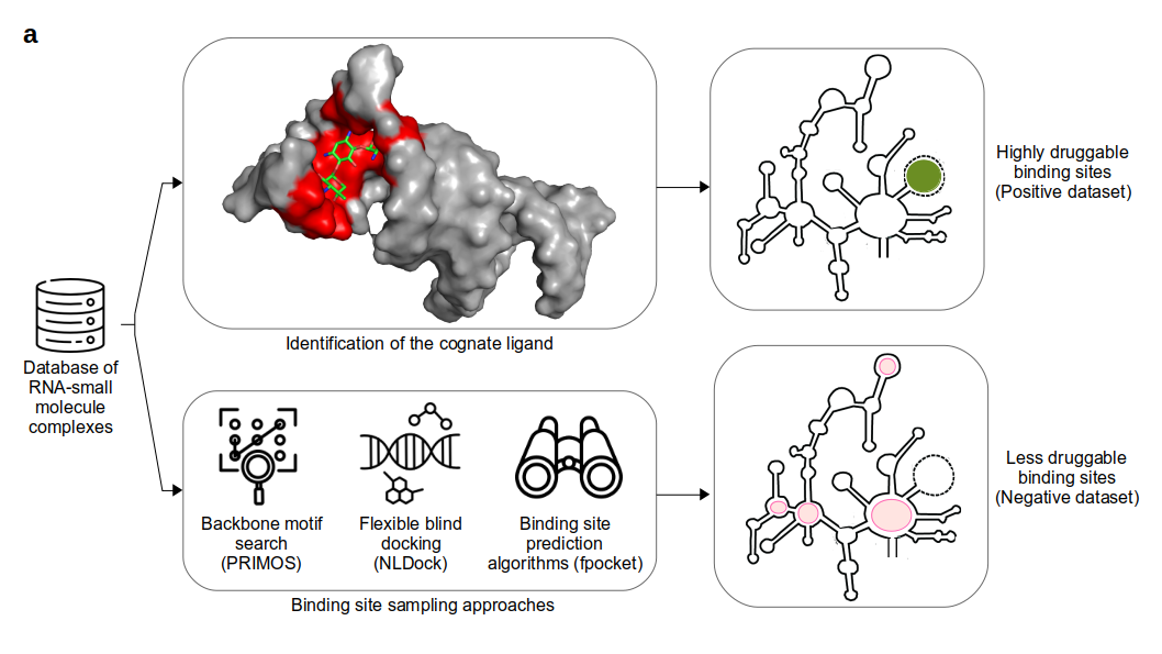 The dataset used to train the RNA druggability prediction model in DRLiPS server is curated from the Protein Data Bank (PDB) and HARIBOSS databases. A total of 1,073 RNA-small molecule complex structures were collected and pruned to 861 structures to remove structure stabilizing ligands (like spermine), ion-bound riboswitches and synthetic RNA aptamers. This dataset was further sub-divided into 513 ribosomal RNA complexes and 348 non-ribosomal complexes. Out of the 513 ribosomal complexes, only 51 complexes with the aminoacyl tRNA site (A-site) of the 16S rRNA were retained along with non-ribosomal complexes, resulting in a total of 399 structures as our positive dataset (highly druggable binding pockets). Residues within 6.5 Å of the bound ligand were considered to form the RNA-ligand binding pocket.