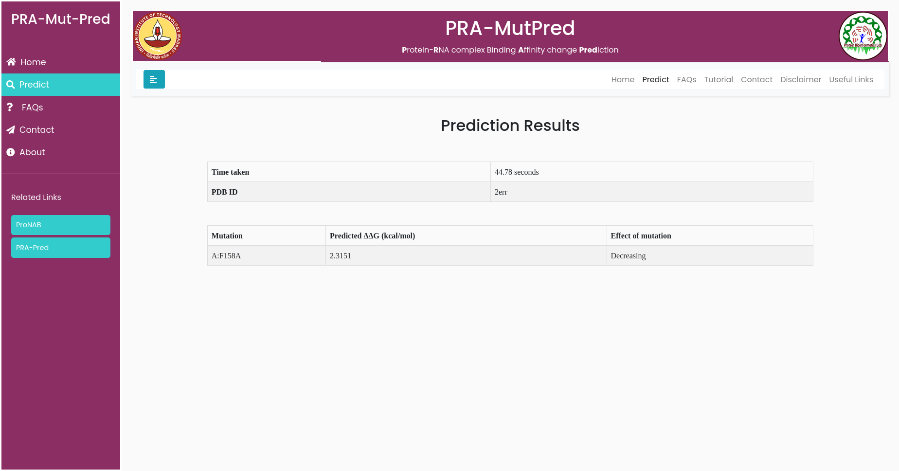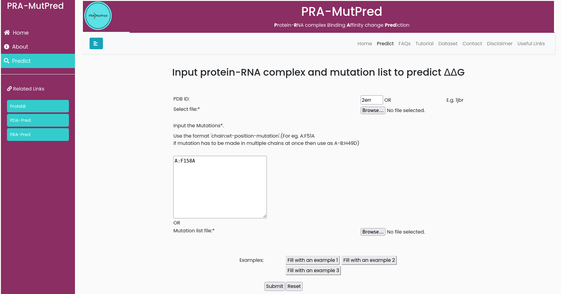 This page takes input of protein-RNA complex and mutation to predict the binding affinity change upon mutation.